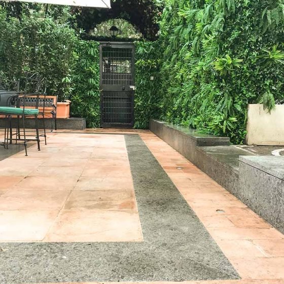 Particolare l’intervento nel giardino di pertinenza dov’è stata realizzata la pavimentazione in cotto fatto a mano totalmente su misura per colore e dimensioni come da richiesta dell’architetto e della proprietà.