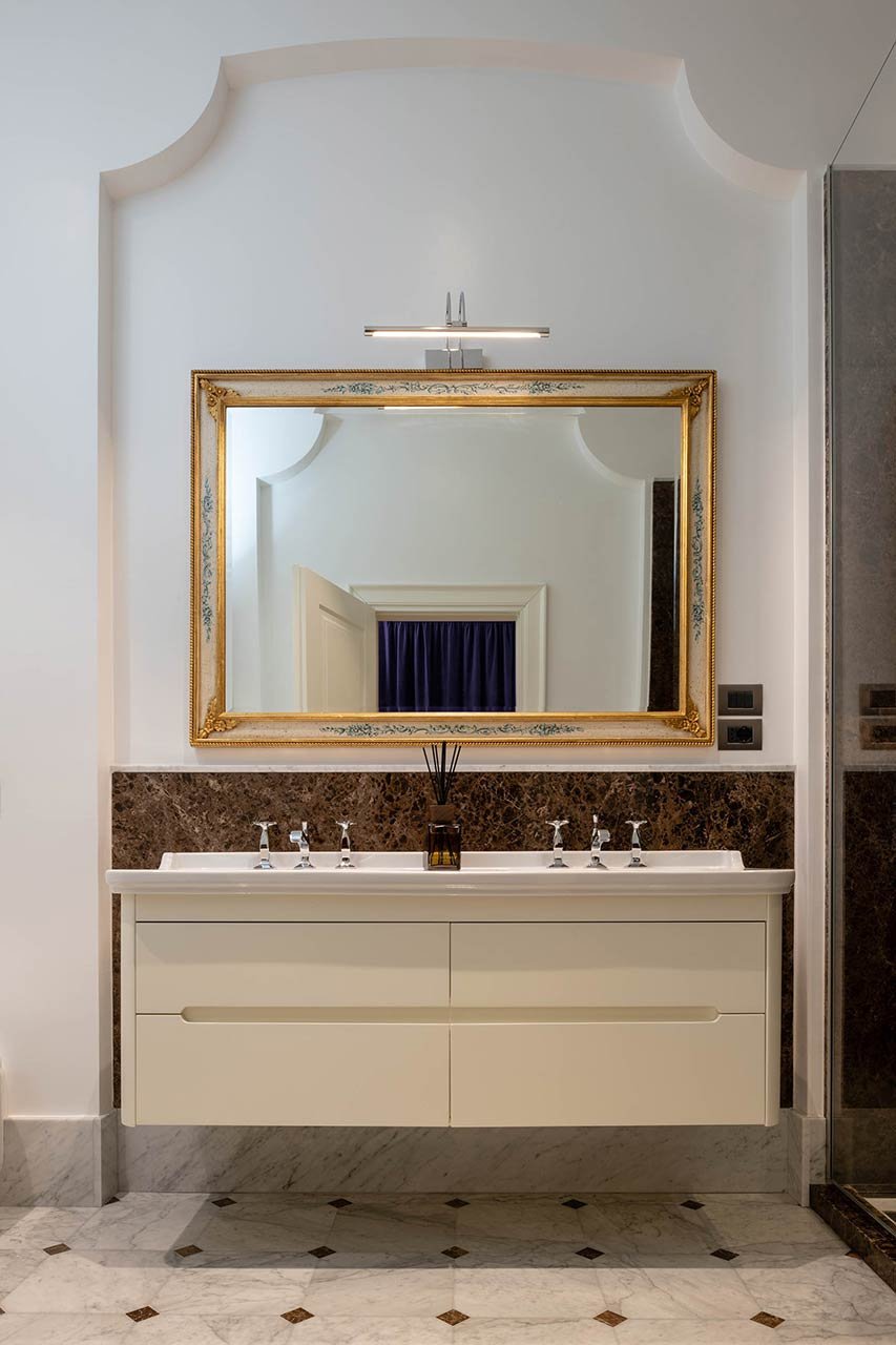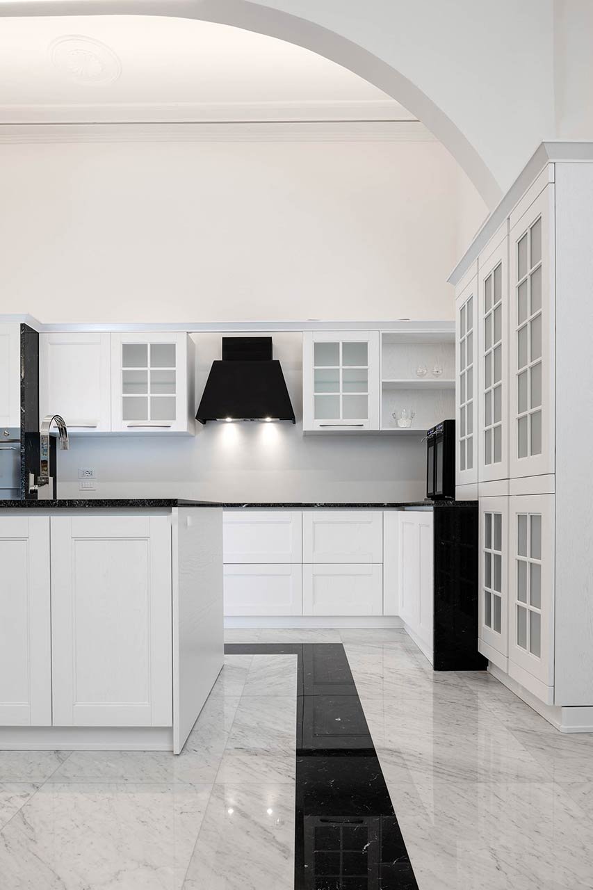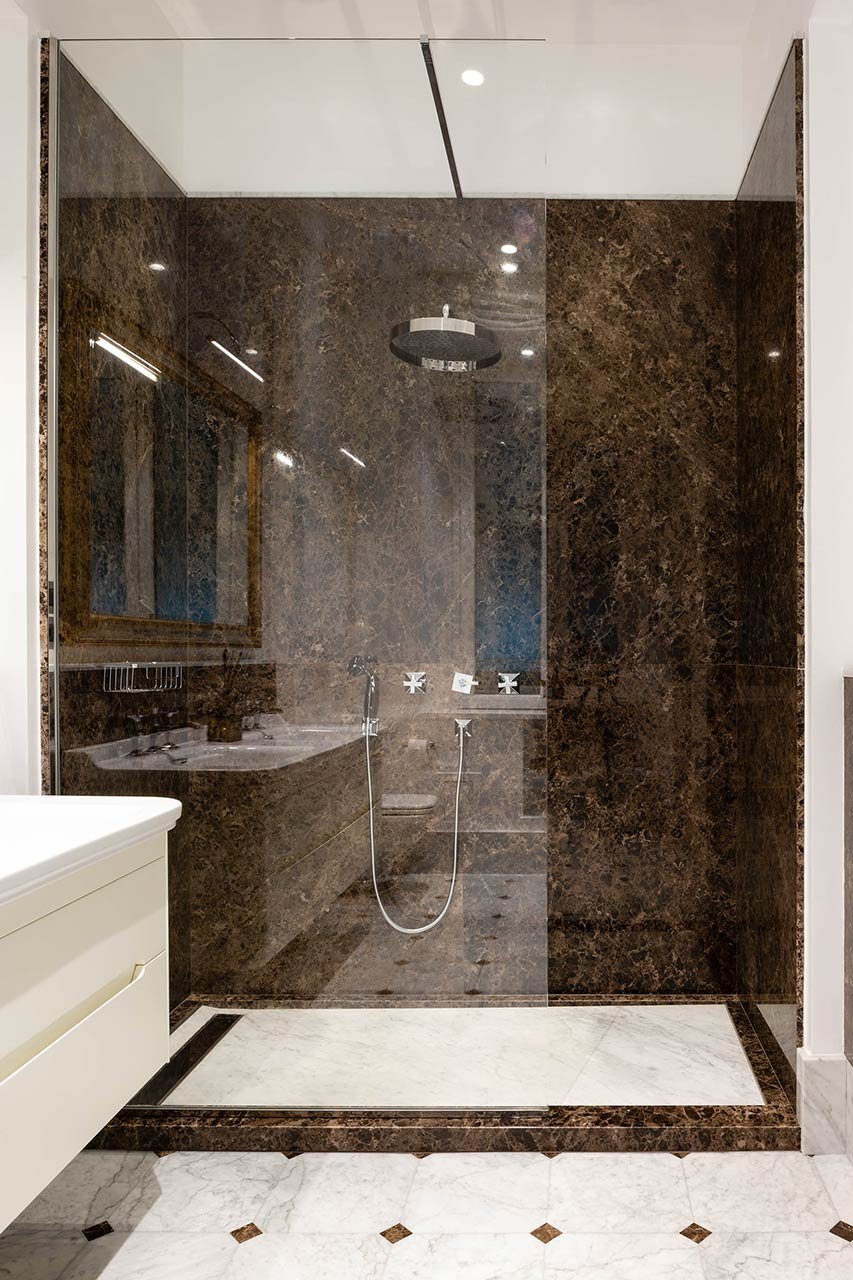 Un lavoro di ricerca e selezione di numerosi marmi utilizzati per pavimenti e rivestimenti della nuova cucina e dei nuovi bagni.
