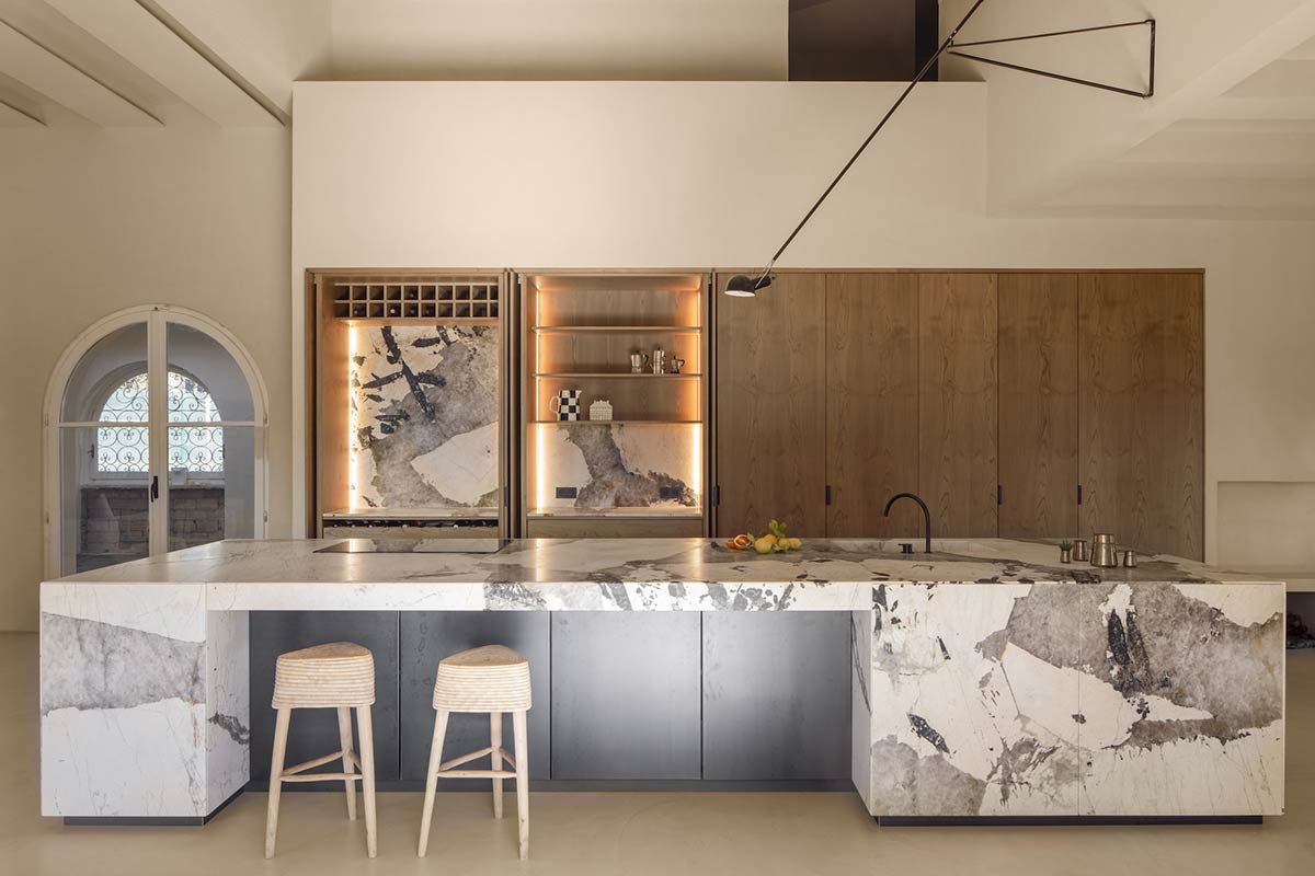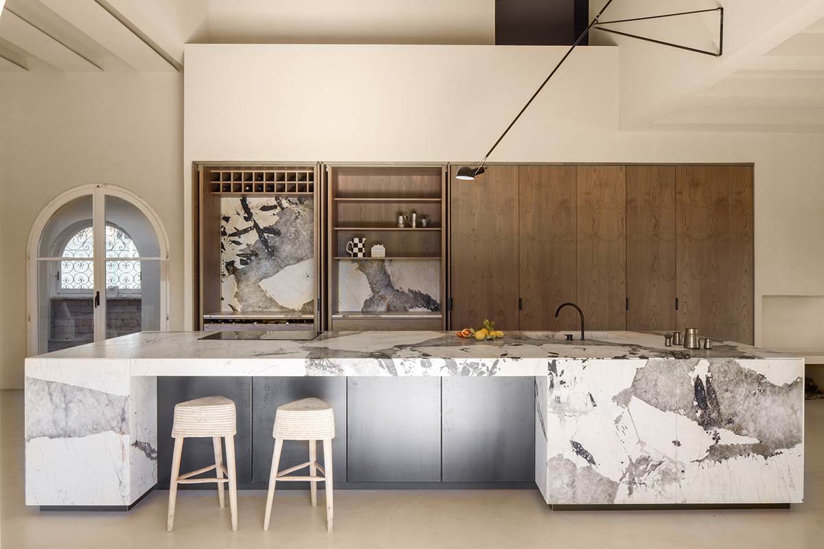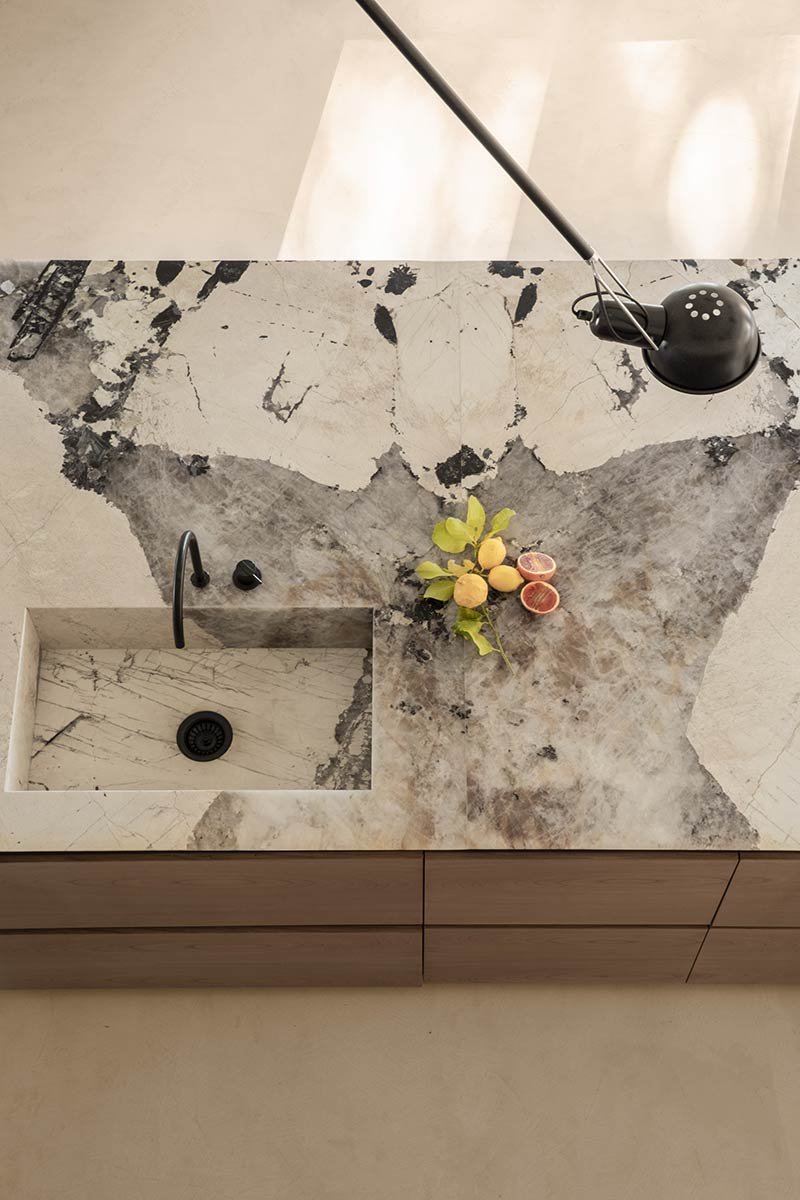 Il granito Patagonia, originario del Brasile, è stato scelto per realizzare il bancone della cucina. Una lavorazione del materiale affidata e gestita da Krei e Fratelli Marmo con tagli, assemblaggi e posa finale.