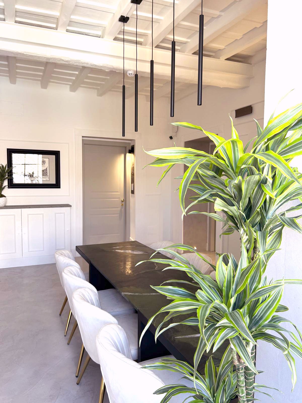 Tra sofisticati mobili artigianali italiani e camini in pietra originali, spiccano i tavoli custom-made concepiti appositamente per Palazzo Goldoni da Krei e Progetto Nudo.