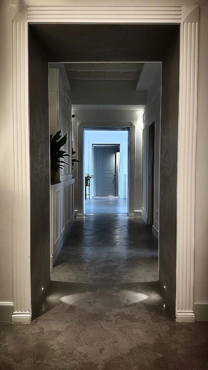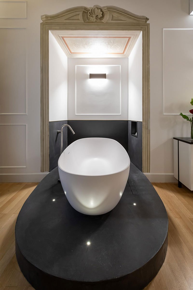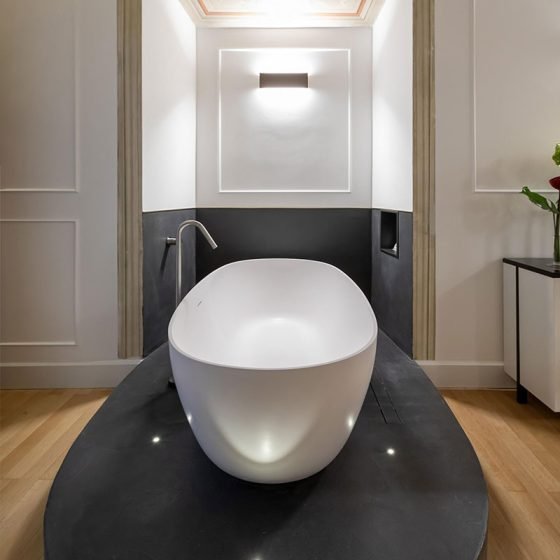 La superficie continua priva di fughe e dall’effetto materico è presente in numerose parti della struttura, sia nelle hall che nei corridoi, nello specifico, il sib hardcrete a basso spessore delle Concrete Solution lavorata dall’azienda Trattamento pavimenti. Lo stesso materiale dal fascino materico in total black è utilizzato anche come finitura per la base delle vasche ellittiche free standing presenti nelle suite.