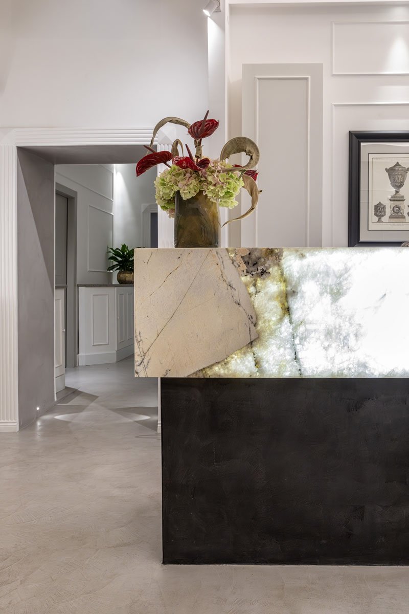 Un lavoro totalmente custom-made in linea con lo stile esclusivo dell’edificio, un progetto di restyling come partner per la ricerca, selezione e fornitura di materiali diversi: superficie continua, marmi e quarziti.