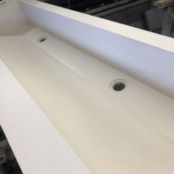 Non solo marmi, ma la realizzazione di lavabi tagliati ed assemblati, come da progetto, su grandi lastre di gres porcellanato fornite dall’azienda Marazzi.