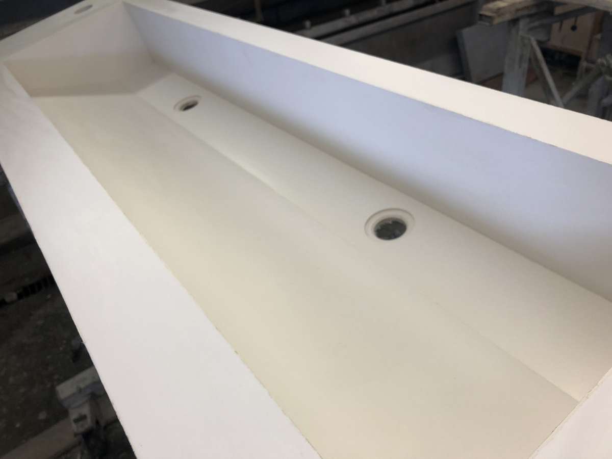 Non solo marmi, ma la realizzazione di lavabi tagliati ed assemblati, come da progetto, su grandi lastre di gres porcellanato fornite dall’azienda Marazzi.