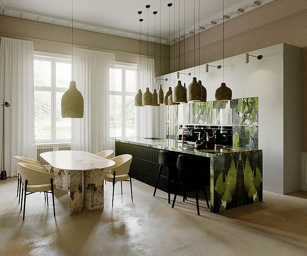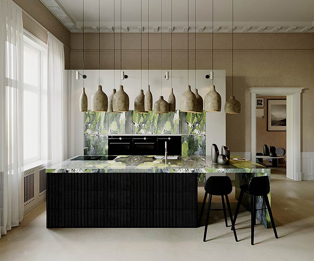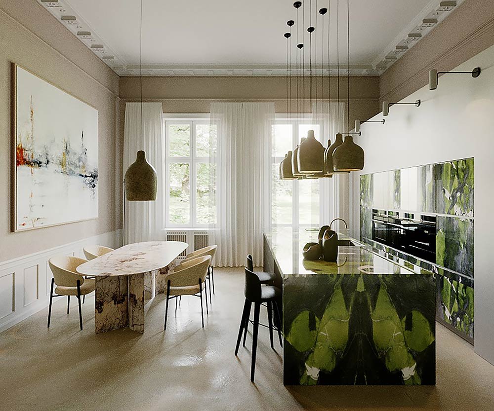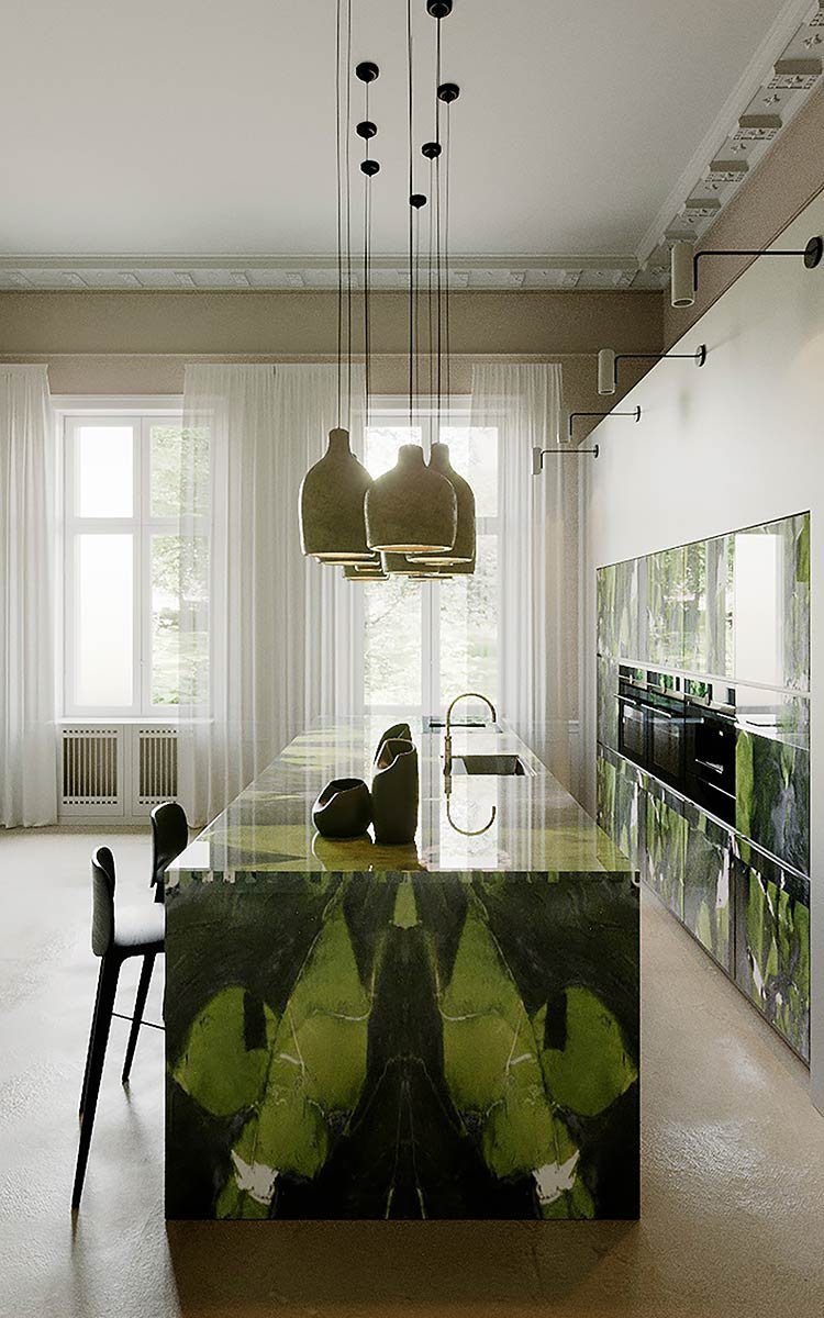 Nell’ambiente della cucina è la quarzite verde avocado che impreziosisce il bancone principale. Scelta tra più blocchi e lavorata da Fratelli Marmo, è un pezzo unico rifinito artigianalmente.