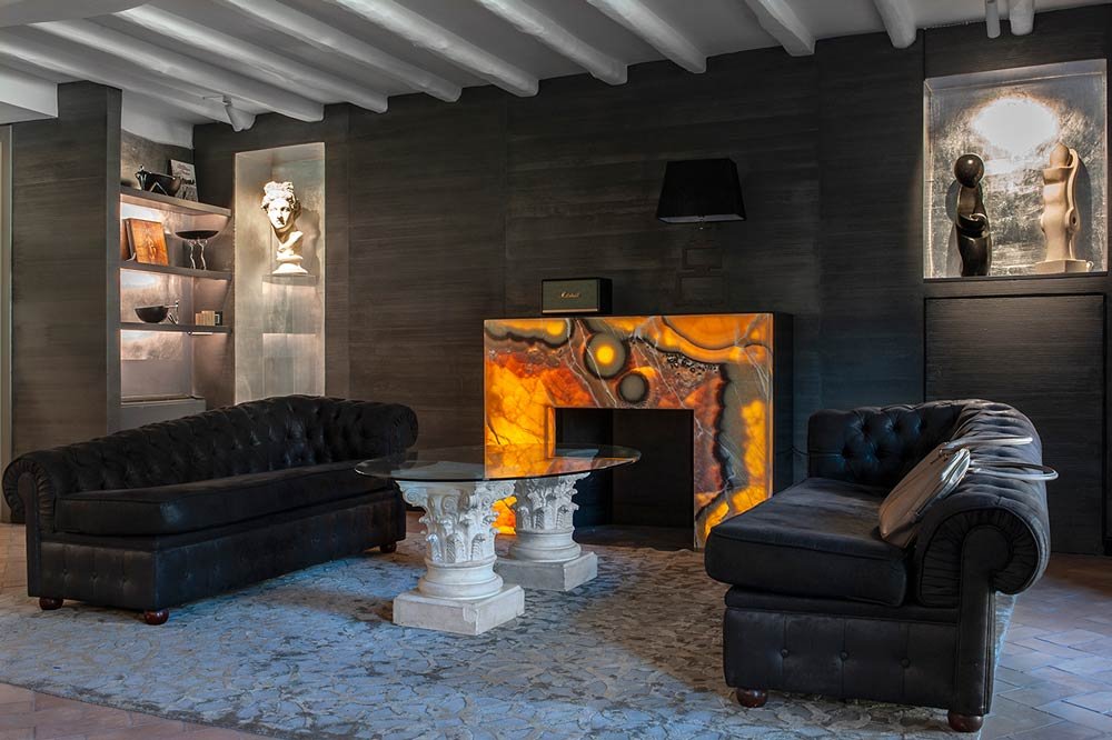 Non è funzionante ma solo scenografico: in legno rivestito frontalmente con una lastra di onice nuvolato extra, selezionata presso Fratelli Marmo di Montefiascone -VT (fratellimarmo.com). Prima di montare la lastra, è stata fissata una striscia led assemblata con particolari tecniche che permettono alla luce all’interno di essere omogenea e non creare ombre. Per il top, i fianchi e l’interno si è utilizzato marmo nero. Come complemento d’arredo sopra il camino: la lampada Pyramis di It’s Stone con base in pietra basaltina.