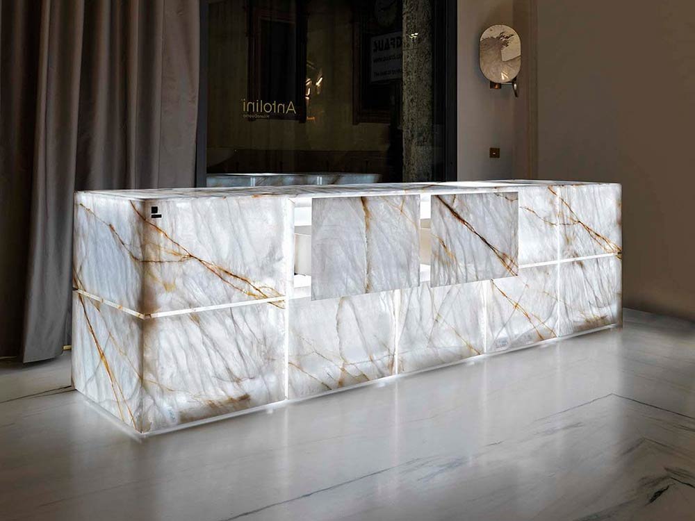 Krei, punto di riferimento per progettisti e designer e Fratelli Marmo, partner ufficiale di Antolini Luigi & C. Spa, leader mondiale per l’estrazione e la lavorazione della pietra naturale e del cristallo, supportano il committente nella selezione, fornitura e posa in opera del quarzo naturale che meglio mette in valore l’unicità degli spazi.