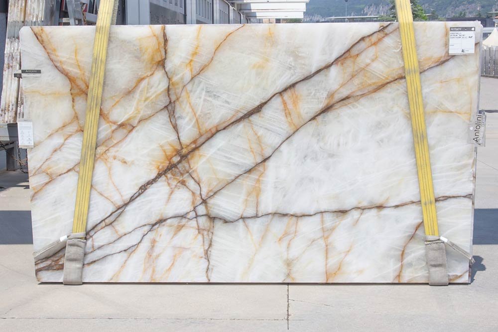 La presenza di minerali accessori regala alla pietra una lucentezza vitrea che rende il cristallo traslucido, trasparente e retroilluminabile. Per questa sua particolare possibilità di essere retroilluminato, può rispecchiare la cromia più desiderata dal committente.