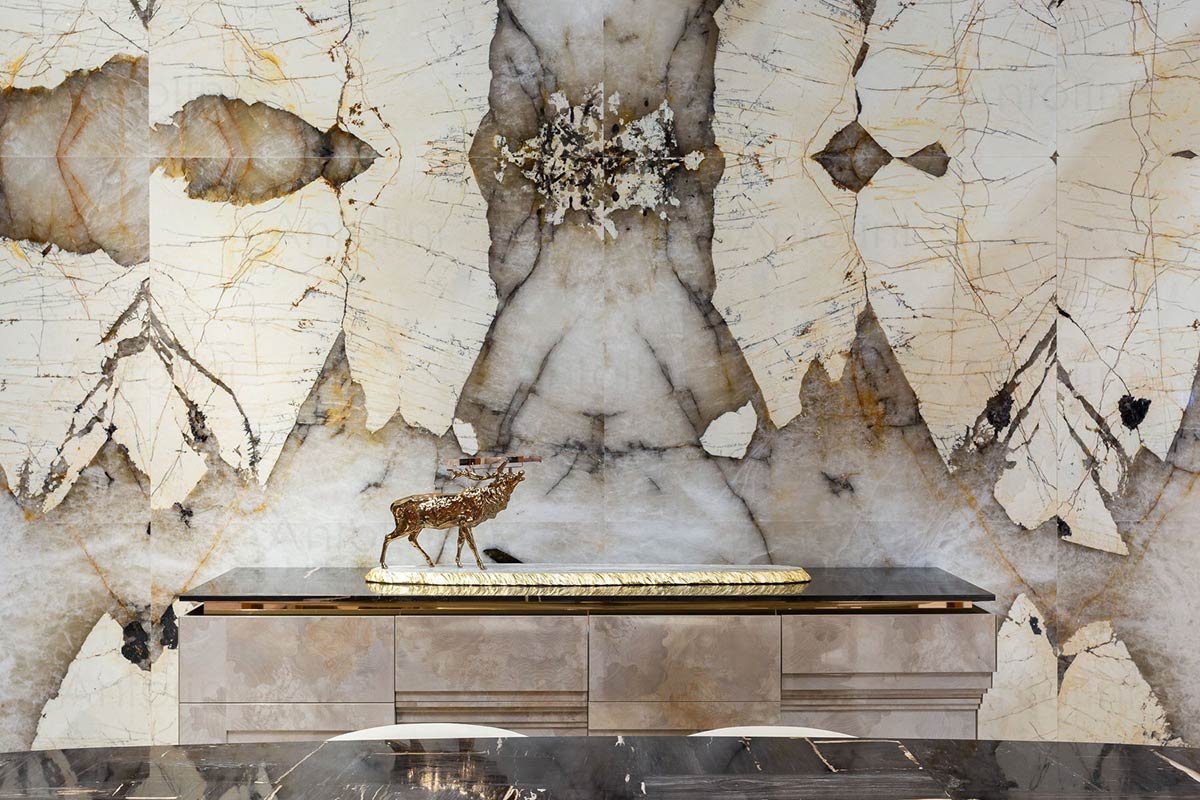 Tra gli effetti scenografici regalati dal Patagonia, il gioco di luce tra la parte marmorea naturale e la lucidità della parte quarzitica è sorprendente: ognuno di noi riesce a costruire immaginari fantastici quando più lastre sono tagliate e montate vicine a macchia aperta. L’anima caotica del Patagonia disegnata da sfumature imperfette regala ad ambienti domestici, hotel, uffici, ristoranti un’estrema raffinatezza naturale.