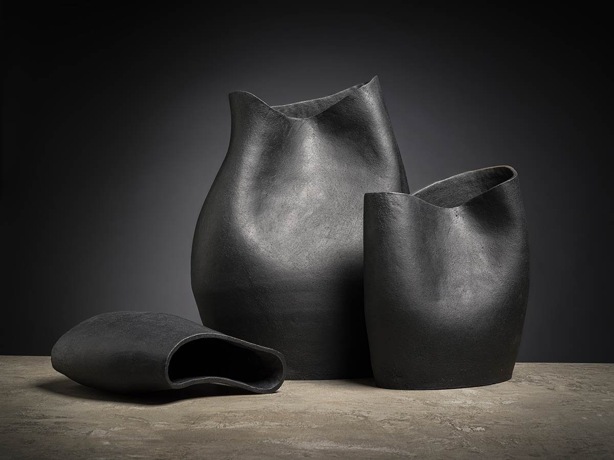 Alcara è il vaso scultoreo che esibisce una silhouette sinuosa modellando la tipica ceramica nera resa ancor più affascinante dalla caratteristica superficie lucente del bucchero