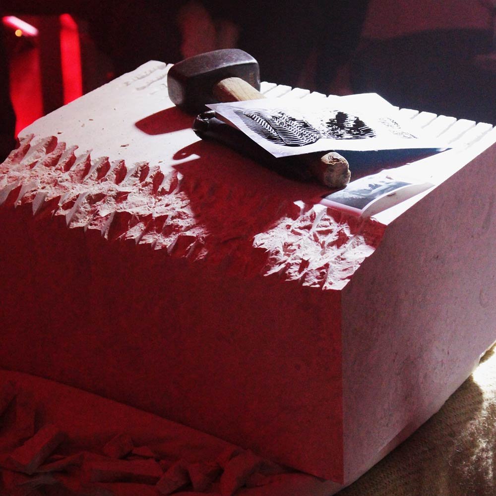 Nella live performance affidata a Molon, il marmo daino reale svelerà le sue vibrazioni interne: i movimenti energici tipici della lavorazione della pietra per mano di esperti artigiani, producono suoni suggestivi che verranno ripresi in real time e trasformati in composizioni musicali armoniche inedite.