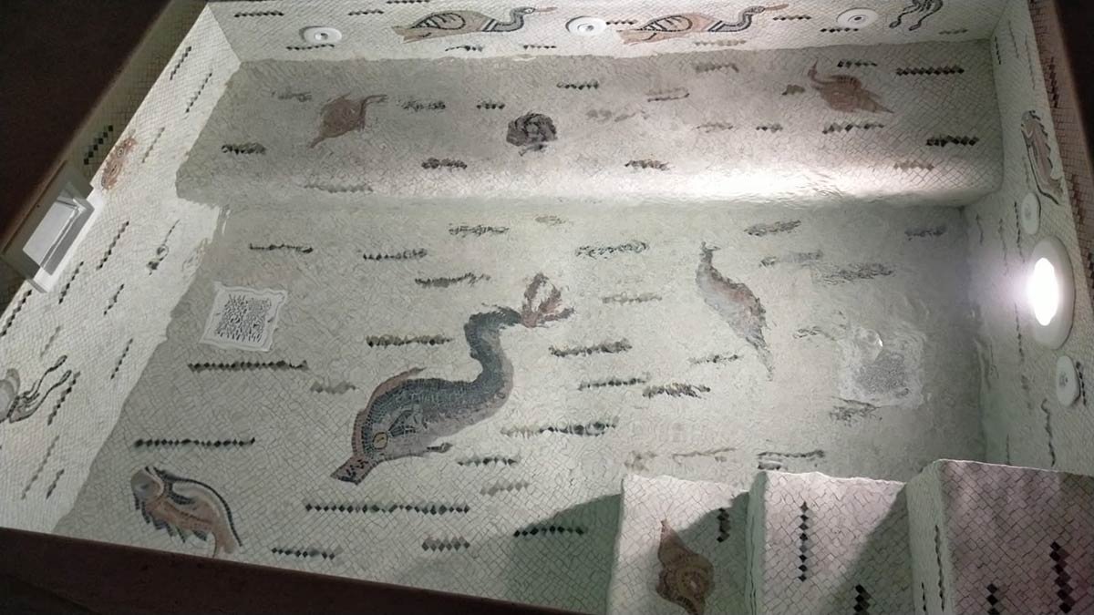 Nello specifico si tratta della riproduzione di un mosaico romano conservato in Tunisia riproducente la fauna marina, come tipico dell’epoca romana.