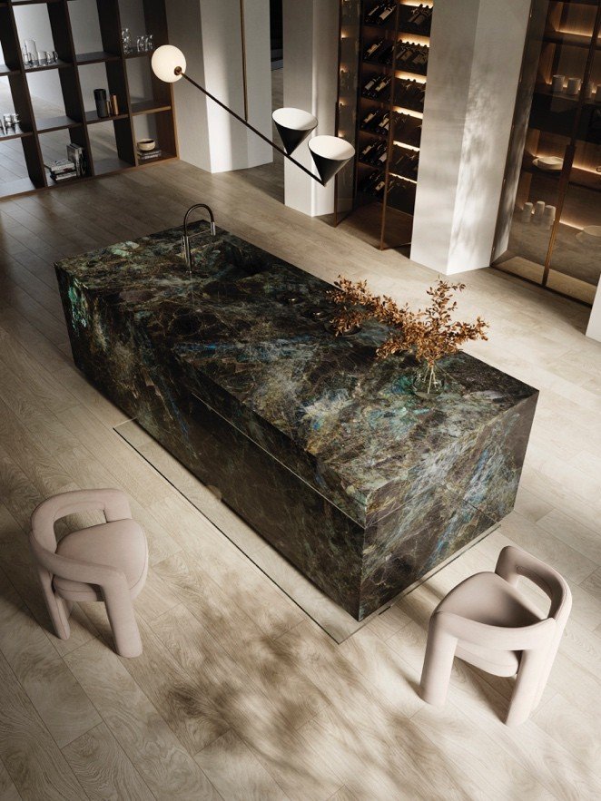 Queste qualità rendono la labradorite molto apprezzata per i progetti di interior design dell’ambiente domestico della cucina e di locali come cocktail bar e ristoranti.