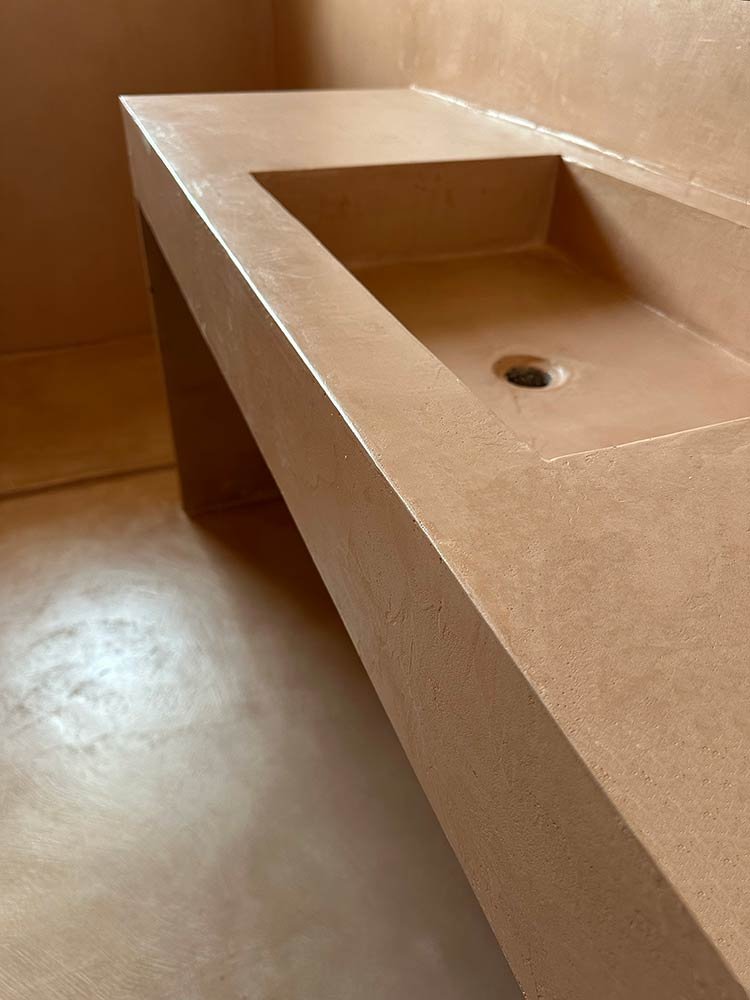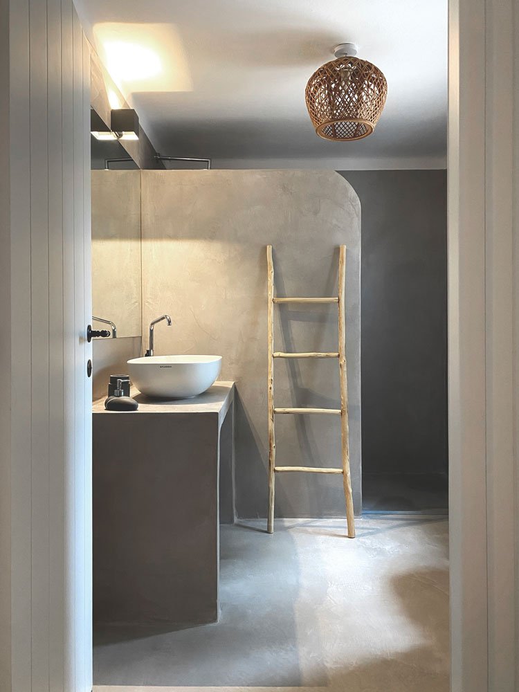 Numerosi gli ambienti personalizzati in microcemto, dai pavimenti ai rivestimenti insieme ai lavabi dei bagni rivestiti in colori diversi utilizzando basi in peperino.