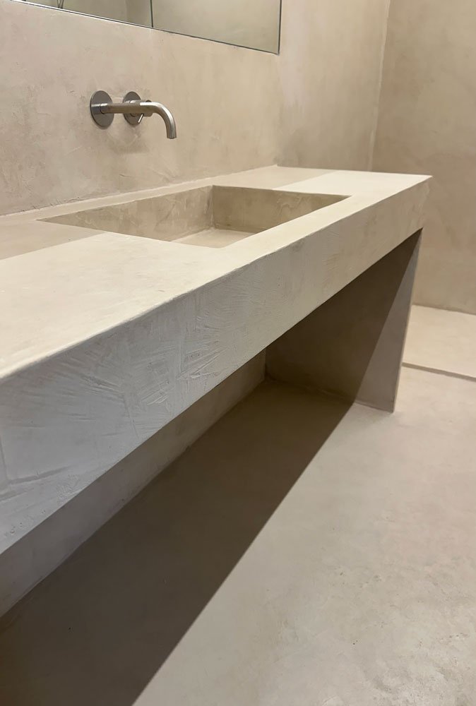 Il microcemento può classificarsi come una famiglia di superfici continue di ispirazione industriale, utilizzato per pavimenti e rivestimenti, scale e anche piani cucina e lavabi. Un materiale innovativo composto da cemento, additivi e pigmenti minerali.