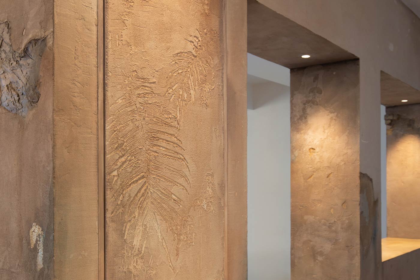 Il sistema decorativo realizzato scava tra le pieghe della storia facendo riemergere tracce del passato; echi del lusso delle domus romane, dove la decorazione parietale affrescata era particolarmente diffusa, vengono qui consolidati per creare una narrazione materico-percettiva.