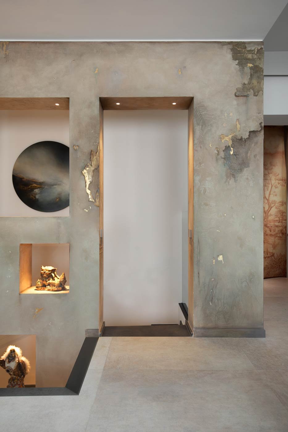 Nell’ambito del progetto di rinnovo di una prestigiosa abitazione romana, nell’area dei Fori Imperiali, Krei ha partecipato al restyling come partner dell’architetto Mario Mallucci, occupandosi di decorazioni murali custom-made: antichi fossili vegetali incastonati nell’elemento decorativo parietale, come traslati nel tempo sulla superficie, in una commistione di naturale e artificiale.