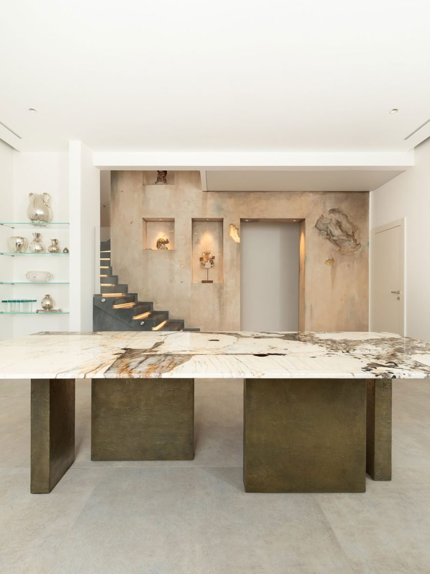 Il maestoso tavolo in granito Patagonia di Antolini, lavorata e rifinita da Fratelli Marmo, esalta l’ambiente grazie alla sua tonalità scenografica: KT 023 è un complemento d’arredo unico, il risultato della collaborazione tra Krei, progetto nudo e Francesco Pogliaghi. Un oggetto che esce dall’ordinario, forte di lavorazioni sperimentali e finiture a mano, in grado di mettere in valore materiali di estrema bellezza e dalla storia millenaria, alla luce di artigianalità e tecnologia.