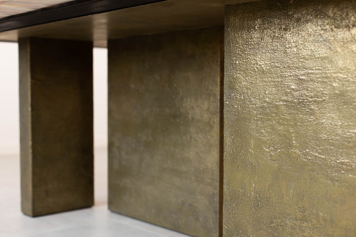 Le gambe sono realizzate in ferro in una fusione a freddo con graniglia di ottone micronizzata e stesa a mano libera.
