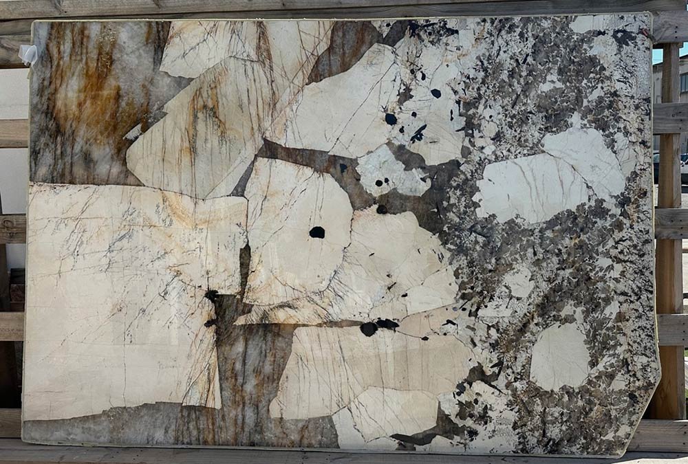 Un tavolo di design, il cui piano valorizza il fascino delle superfici materiche: una lastra di marmo Patagonia selezionata tra più blocchi, regala il gioco di luce tra la parte marmorea naturale e la lucidità della parte quarzitica, sorprendente.